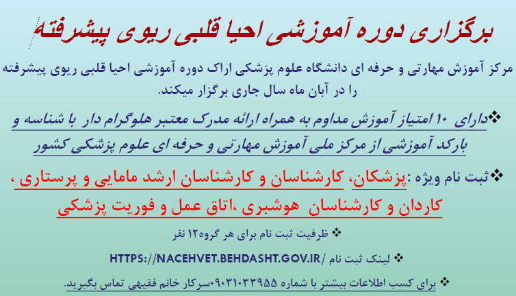 اطلاعیه برگزاری دوره آموزشی احیا قلبی ریوی پیشرفته ۰۸ مهر ۱۴۰۲ | ۱۰:۲۰ کد : ۳۷۹۸۷ اطلاعیه ارسال به دیگران نام شما ایمیل شما ایمیل دریافتکننده ارسال انصراف تعداد بازدید:۱۷۴۷۸
