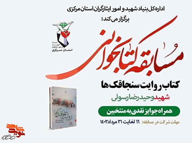 بنیاد شهید و امور ایثارگران استان مرکزی ، به مناسبـت سالروز ورود آزادگان سرافراز به میهن اسـلامی در تاریخ 26 مرداد مـاه ، مسـابقـه ای از کتاب " روایت سنجاقک ها " سرگذشت نامه شهید وحیدرضا رسولی به صورت مجازی در سایـت نوید شاهــد به شــرح ذیل برگـزار می نماید.