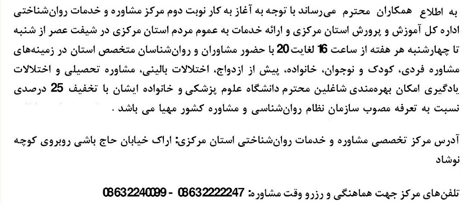 مرکز تخصصی مشاوره وخدمات روانشناختی ۱۲ آبان ۱۴۰۳ | ۱۳:۰۴ کد : ۴۷۳۷۱ اطلاعیه ارسال به دیگران نام شما ایمیل شما ایمیل دریافتکننده ارسال انصراف تعداد بازدید:۱۰۴۲۷ آغاز به کار نوبت دوم (شیفت عصر) مرکز تخصصی مشاوره و خدمات روانشناختی اداره کل آموزش و پرورش استان مرکزی و ارائه خدماات با تخفیف ۲۵ درصدی به شاغلین دانشگاه علوم پزشکی