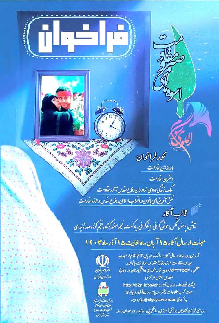 اداره کل حفظ آثار و نشر ارزش های دفاع مقدس استان مرکزی ، دوازدهمین همایش اسوه های صبر و مقاومت را به مناسبت میلاد دخت گرامی نبی مکرم اسلام حضرت پیامبر (ص) در دی ماه سال جاری برگزار می نماید.