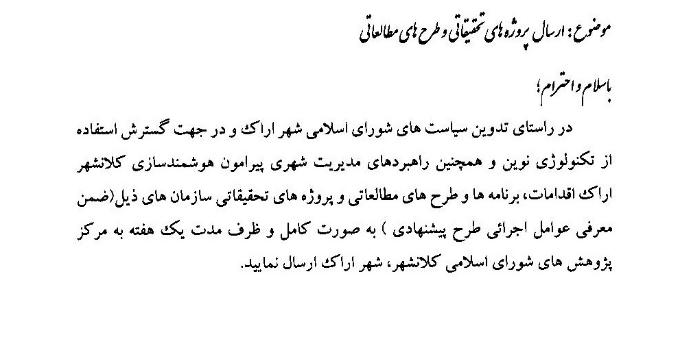 شورای اسلامی شهر اراک در خصوص ارسال پروژه های تحقیقاتی و طرح های مطالعاتی به شرح ذیل اطلاع رسانی نموده است.