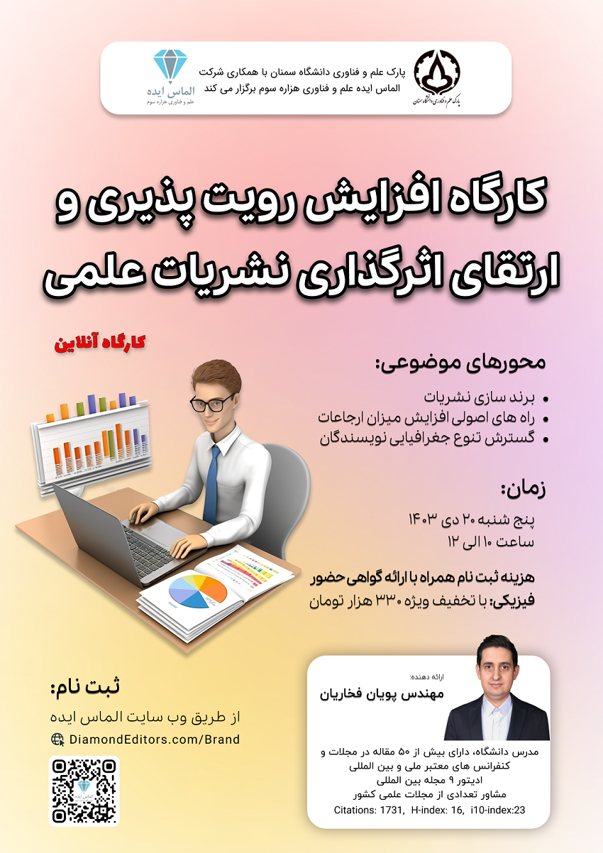 به اطلاع اساتید و دانشجویان می رساند، پارک علم و فناوری دانشگاه سمنان با همکاری شرکت الماس ایده علم و فناوری هزاره سوم کارگاه آنلاین افزایش رویت پذیری و ارتقای اثرگذاری نشریات علمی را در روز پنج شنبه ۲۰ دی ۱۴۰۳، ساعت ۱۰ الی ۱۳ برگزار می نماید. امکان ارائه گواهی فیزیکی معتبر از شرکت الماس ایده علم و فناوری هزاره سوم و پارک علم و فناوری دانشگاه سمنان به شرکت کنندگان وجود دارد.