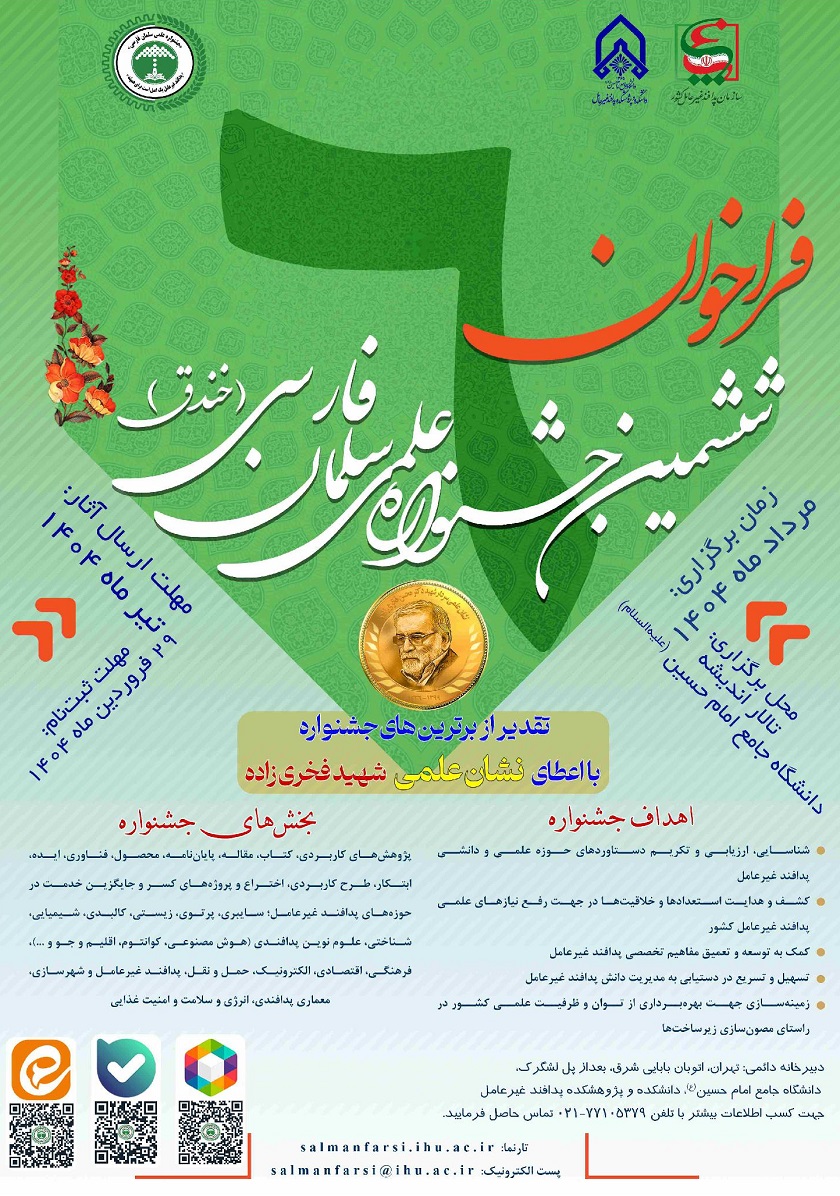 به اطلاع می رساند، سازمان پدافند غیرعامل کشور با مشارکت دانشگاه جامع امام حسین (ع) با اهداف شناسایی، ارزیابی، معرفی و ارج نهادن به مقام والای دانش آموختگان، پژوهشگران، مبتکران، مخترعان و مولفان آثار برگزیده و برتر در حوزه پدافند غیرعامل، ششمین جشنواره علمی سلمان فارسی (خندق) را در مرداد ماه 1404 برگزار می نماید. پوستر جشنواره پیوست می باشد.