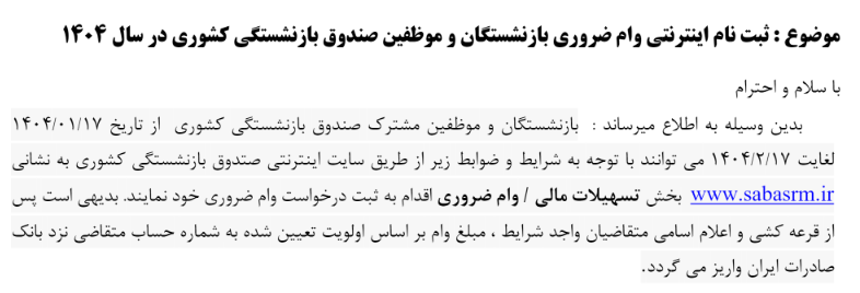 ثبت نام اینترنتی وام ضروری بازنشستگان و موظفین صندوق بازنشستگی کشوری ۲۰ فروردین ۱۴۰۴ | ۱۱:۵۹ کد : ۵۰۶۴۱ اطلاعیه ارسال به دیگران نام شما ایمیل شما ایمیل دریافتکننده ارسال انصراف تعداد بازدید:۵۰۰۱ ثبت نام اینترنتی وام ضروری بازنشستگان و موظفین صندوق بازنشستگی کشوری