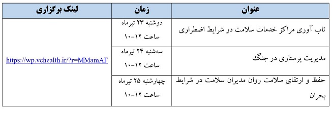 کلیدواژه‌ها: کارگاه بحران سلامت غیر حضوری کارگاه غیرحضوری مدیریت بحران و بلایا بلایا مدیریت بحران مدیریت بلایا