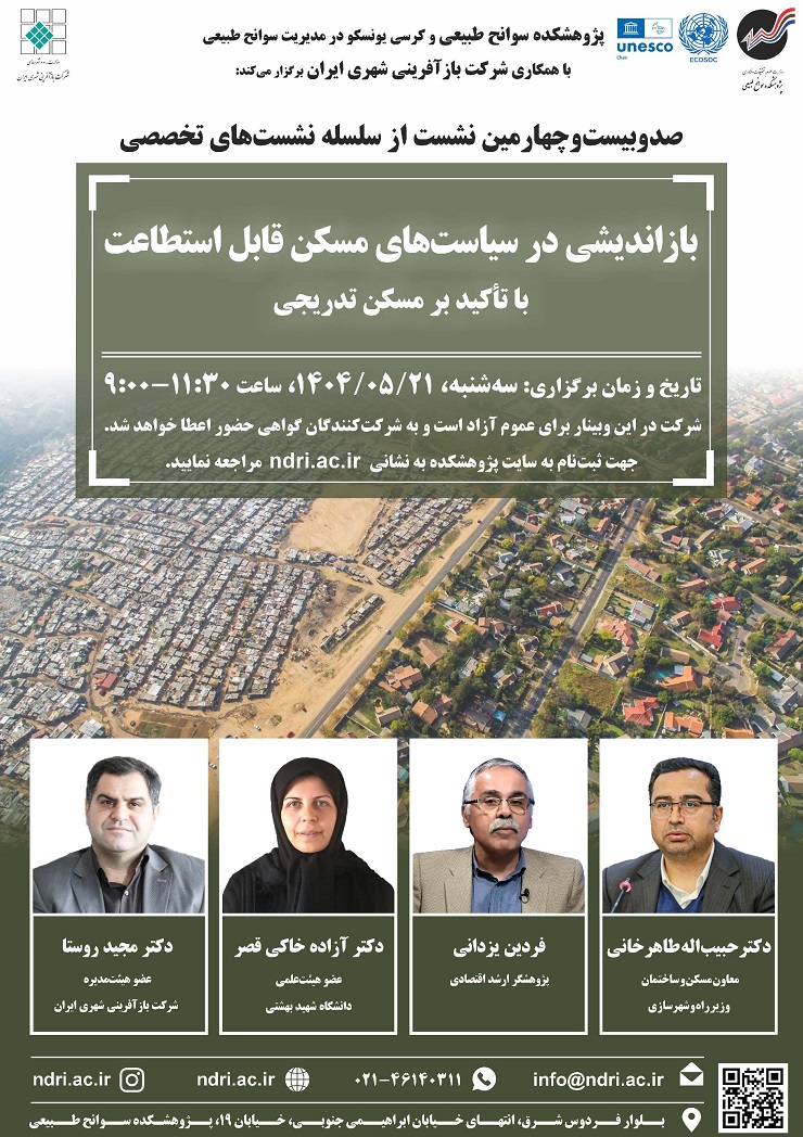 به اطلاع می رساند صدو بیست و چهارمین نشست از سلسله نشست های تخصصی با عنوان " بازاندیشی در سیاست های مسکن قابل استطاعت با تأکید بر مسکن تدریجی " در روز سه شنبه مورخ ۱۴۰۴٫۰۵٫۲۱ ساعت ۹:۰۰  الى ۱۱:۳۰ توسط پژوهشکده سوانح طبیعی و کرسی یونسکو در مدیریت سوانح طبیعی با همکاری شرکت بازآفرینی ایران و با حضور سخنرانان ذیل به صورت برخط برگزار می گردد.