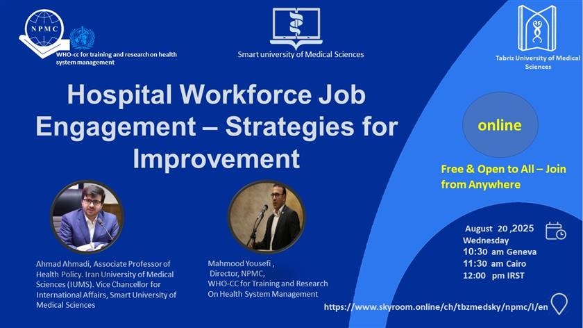 به اطلاع می رساند مرکز ملی آموزش مدیریت سلامت (NPMC) دانشگاه علوم پزشکی تبریز، درنظر دارد، وبینار بین المللی با عنوان Hospital Workforce Job Engagement Strategies for Improvement را در بستر مجازی Skyroom به زبان انگلیسی برگزار نماید.