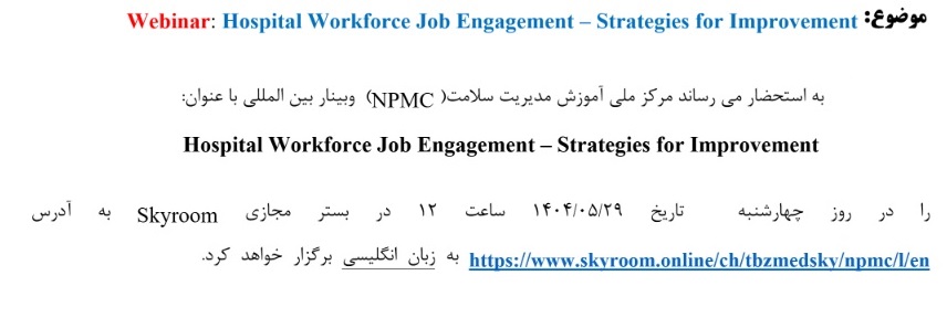 وبینار آموزشی بین المللی Hospital Workforce Job Engagement – Strategies for Improvement ۲۹ مرداد ۱۴۰۴ | ۱۰:۰۱ کد : ۵۳۹۲۵ اطلاعیه ارسال به دیگران نام شما ایمیل شما ایمیل دریافتکننده ارسال انصراف تعداد بازدید:۲۳۹۷ وبینار آموزشی بین المللی Hospital Workforce Job Engagement – Strategies for Improvement