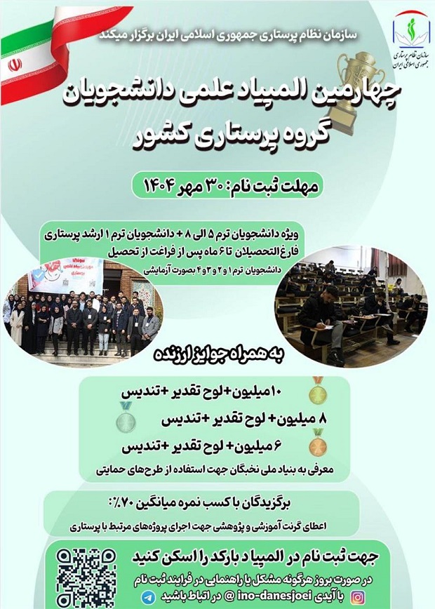 سازمان نظام پرستاری کشور، در راستا تحقق اهداف علمی، ارتقای سطح دانش حرفه ای و ایجاد فضای سالم رقابتی در میان دانشجویان پرستاری سراسر کشور، چهارمین دوره المپیاد علمی دانشجویان پرستاری را در تاریخ 1404/9/27 برگزار می نماید.