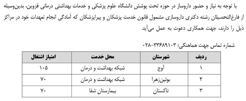 جذب نیروی داروساز مشمول قانون خدمت ۲۵ آذر ۱۴۰۴ | ۰۹:۰۰ کد : ۵۷۰۵۷ اطلاعیه ارسال به دیگران نام شما ایمیل شما ایمیل دریافتکننده ارسال انصراف تعداد بازدید:۱۷۴۹ جذب نیروی داروساز مشمول قانون خدمت در دانشگاه علوم پزشکی قزوین