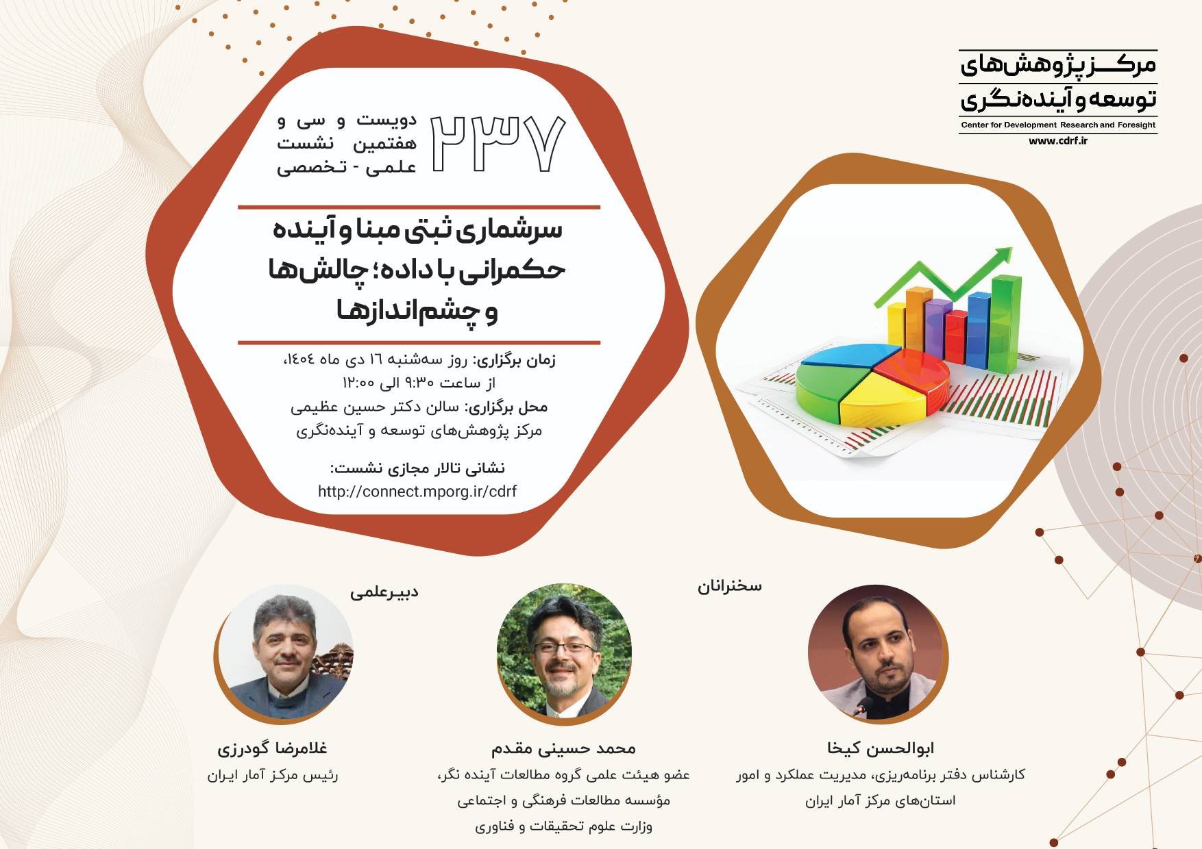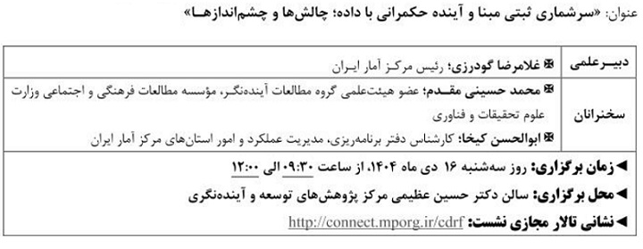 نشست علمی سرشماری ثبتی مبنا آینده حکمرانی با داده ۱۴ دی ۱۴۰۴ | ۱۰:۲۱ کد : ۵۷۴۱۸ اطلاعیه ارسال به دیگران نام شما ایمیل شما ایمیل دریافتکننده ارسال انصراف تعداد بازدید:۴۲۵ دویست وسی وهفتمین نشست علمی - تخصصی با عنوان سرشماری ثبتی مبنا آینده حکمرانی با داده، چالش ها وچشم اندازها