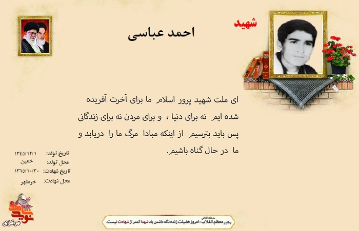فرازی از وصیت نامه شهدا ۱۳ دی ۱۴۰۴ | ۱۰:۰۱ کد : ۵۷۴۶۹ اطلاعیه ارسال به دیگران نام شما ایمیل شما ایمیل دریافتکننده ارسال انصراف تعداد بازدید:۹۷ فرازی از وصیت نامه شهدا فرازی از وصیت نامه شهید بزرگوار احمد عباسی :