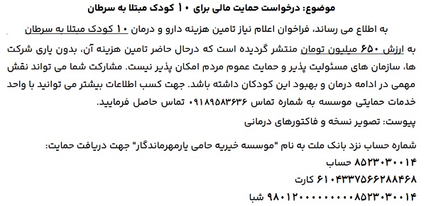 درخواست حمایت مالی، برای ۱۰ کودک مبتلا به سرطان ۰۷ بهمن ۱۴۰۴ | ۱۱:۳۳ کد : ۵۷۷۳۲ اطلاعیه ارسال به دیگران نام شما ایمیل شما ایمیل دریافتکننده ارسال انصراف تعداد بازدید:۴۶ موسسه خیریه حامی یار، درخواست حمایت مالی، برای ۱۰ کودک مبتلا به سرطان را دارد.