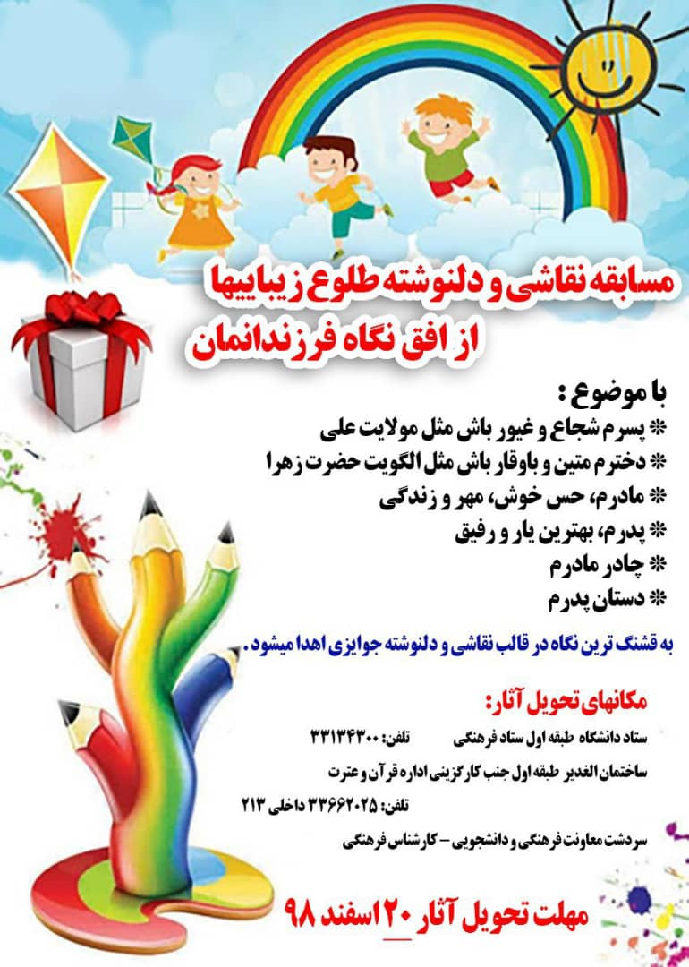 مسابقه نقاشی و دلنوشته طلوع زیبایی ها از افق نگاه فرزندانمان ۱۰ اسفند ۱۳۹۸ | ۰۹:۰۰ کد : ۷۸۷۰ اطلاعیه ارسال به دیگران نام شما ایمیل شما ایمیل دریافتکننده ارسال انصراف تعداد بازدید:۳۹۹۵۳