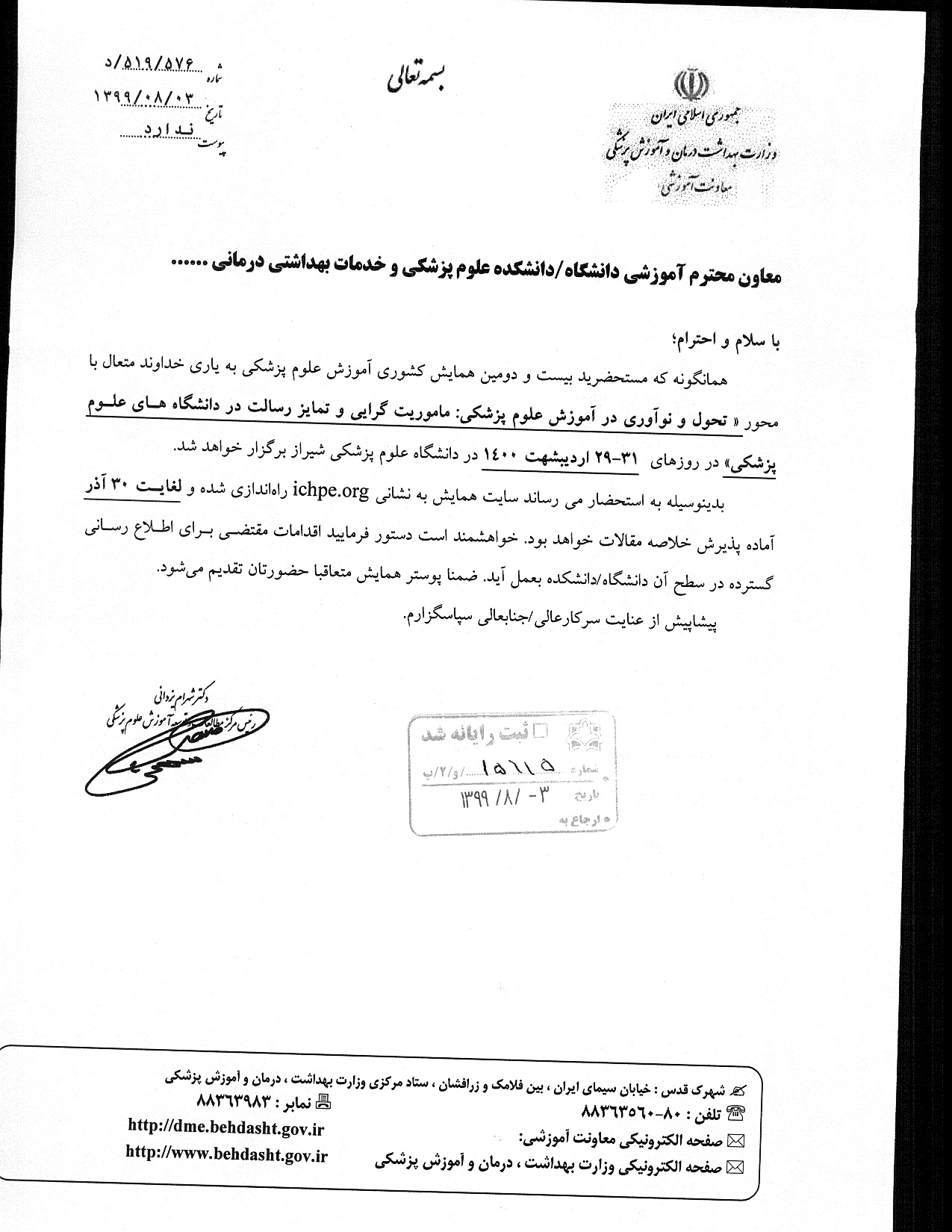بیست و دومین همایش کشوری آموزش پزشکی به همراه چهاردهمین جشنواره اموزشی شهید مطهری و سومین جشنواره دانشجویی ایده های نوآورانه آموزشی در تاریخ29 لغایت 31 اردیبهشت 1400 در دانشگاه علوم پزشکی شیراز برگزار می گردد.