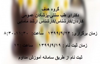 گروه هدف: دکترای طب سنتی با 3 امتیازبازآموزی-پزشکان عمومی-کاردان/کارشناس/کارشناس ارشد مامایی با 1.5 امتیاز بازآموزی