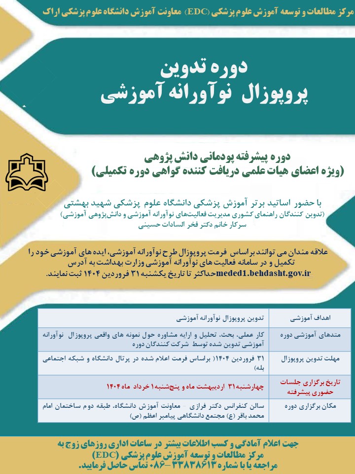 دوره پیشرفته پودمانی دانش پژوهی با عنوان کارگاه نگارش و تدوین پروپوزال نوآورانه آموزشی ۲۷ اسفند ۱۴۰۳ | ۱۲:۵۷ کد : ۵۰۱۹۴ اخبار اسلایدی اخبار اصلی ارسال به دیگران نام شما ایمیل شما ایمیل دریافتکننده ارسال انصراف تعداد بازدید:۶۹۷ جهت دریافت فرمت پروپوزال نوآورانه آموزشی کلیک کنید.