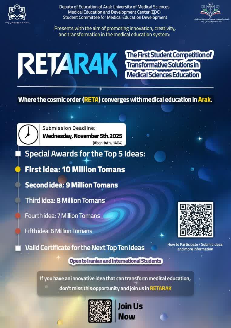 Given the importance of innovation in enhancing the quality of medical education, the Medical Education and Development Centre (EDC) in collaboration with the Student Committee on Medical Education Development of the University of Medical Sciences of Arak, presents the student event "RetARAK: Transformative Education Solutions".