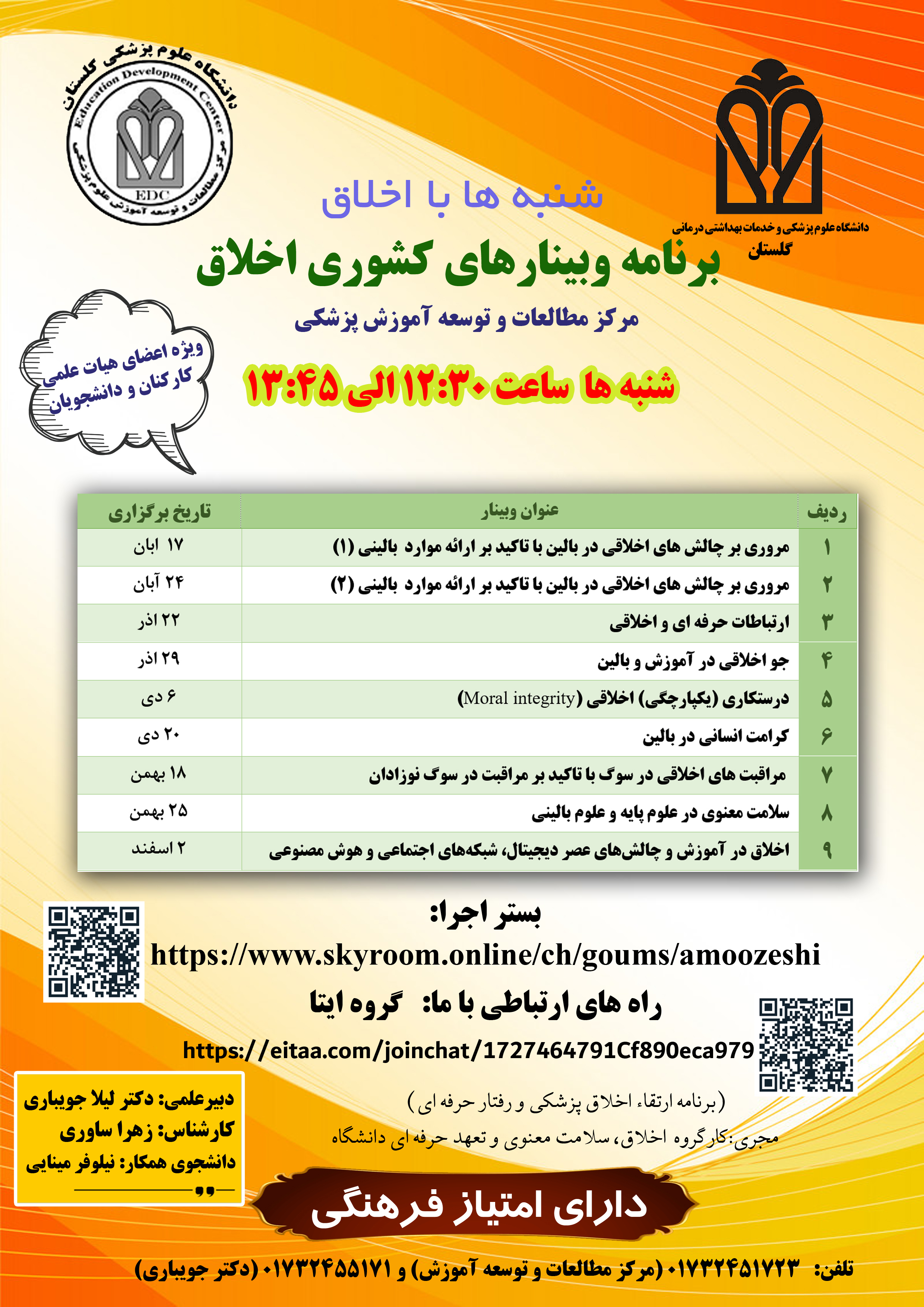 کارگروه اخلاق، سلامت معنوی و تعهد حرفه ای (برنامه ارتقا اخلاق پزشکی و رفتار حرفه ای) مستقر در مدیریت EDC دانشگاه علوم پزشکی گلستان در صدد است در نیمه دوم سال جاری (شنبه ها ، آبان لغایت اسفندماه ) ساعت 12:30 الی 13:45، وبینارهای کشوری با محور «اخلاق، سلامت معنوی و تعهد حرفه ای» ویژه اعضای محترم هیئت علمی، کارکنان گرامی و دانشجویان گرانقدر دانشگاه های علوم پزشکی سراسر کشور به صورت مجازی برگزار نماید.
