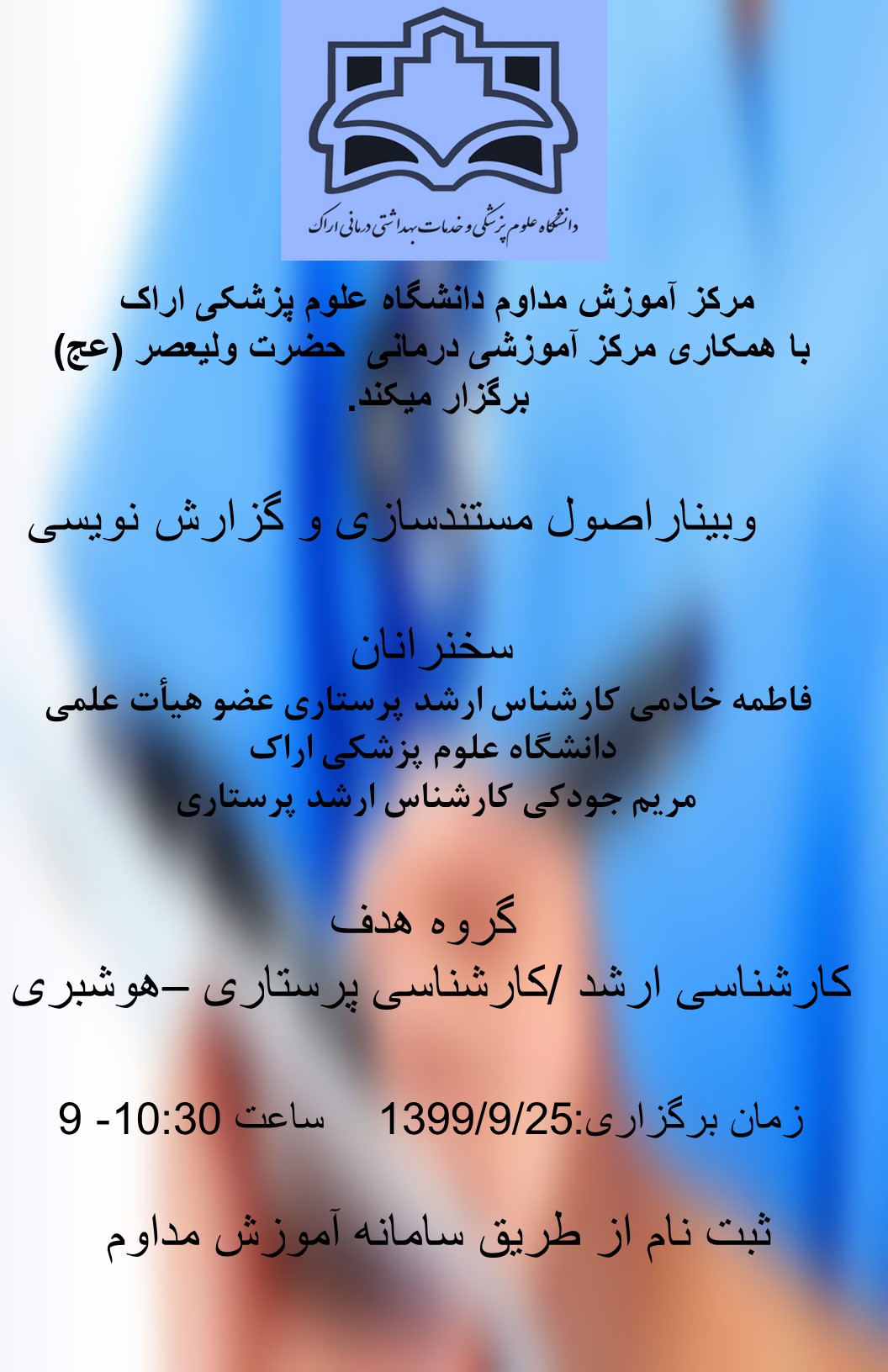 | 16 | 1400/02/25 | 10-13 | مراقبت های پرستاری در صدمات وارده به سر | مرکز درمانی آموزشی ولی عصر(عج) | کارشناس ارشد/کارشناس پرستاری |
